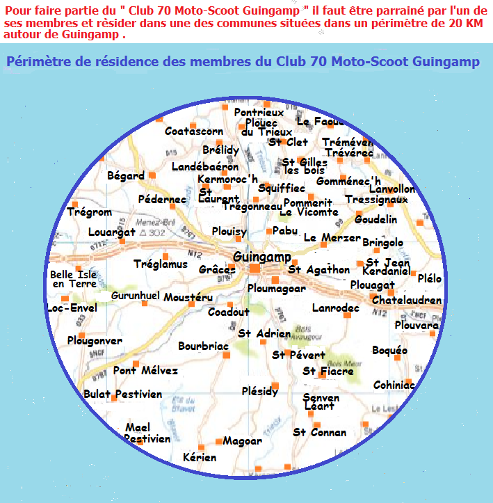 La carte de membre est renouvelée chaque année ( ou en cas de changement de moto ou scooter )et peut être retirée à tout moment par décision de la communauté des membres du club, si les règles de fonctionnement et l'état d'esprit du «Club 70 Moto-Scoot Guingamp » ne sont pas respectés. Les membres du Club 70 Moto-Scoot Guingamp , qui ne donnent pas "signe de vie" durant toute une saison et ne participent à aucune sortie durant la saison , perdent la qualité de membre de la bande des "Ailes de la Route" pour la saison suivante (cette disposition ne s'applique pas aux membres d'honneur de la bande qui demeurent des membres permanents du Club 70 Moto-Scoot Guingamp ) . Les membres du Club 70 Moto-Scoot Guingamp doivent être en possession d'une moto ou d'un scooter d'un minimum de 125 cc, capable d'atteindre au moins les 100km/h, car même si nous n'empruntons pas souvent les voies rapides, les parcours des balades font de 60 km à 300km et il vaut mieux posséder des engins fiables et adaptés pour ces parcours. ;